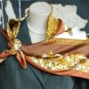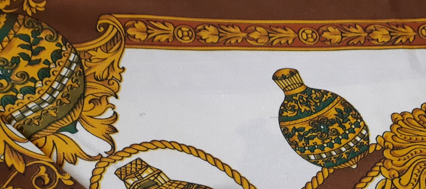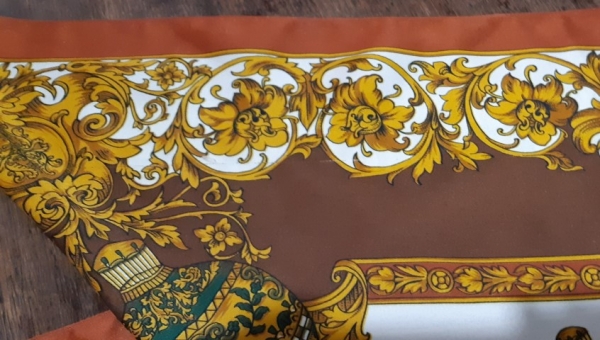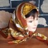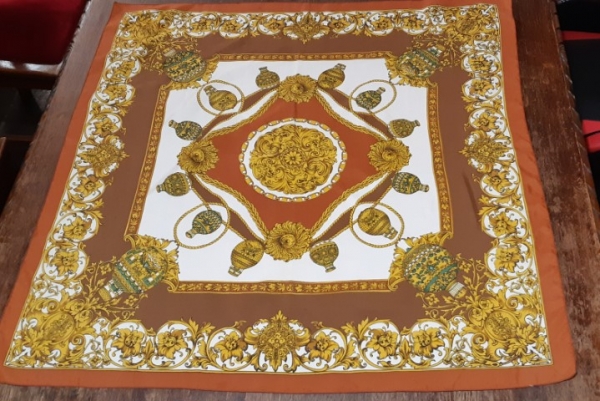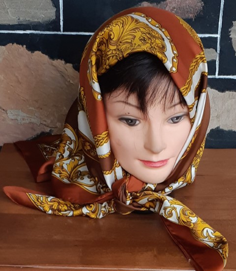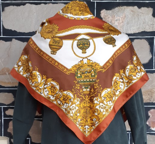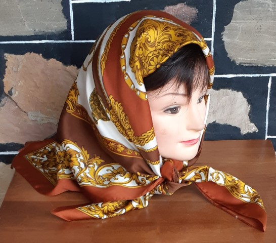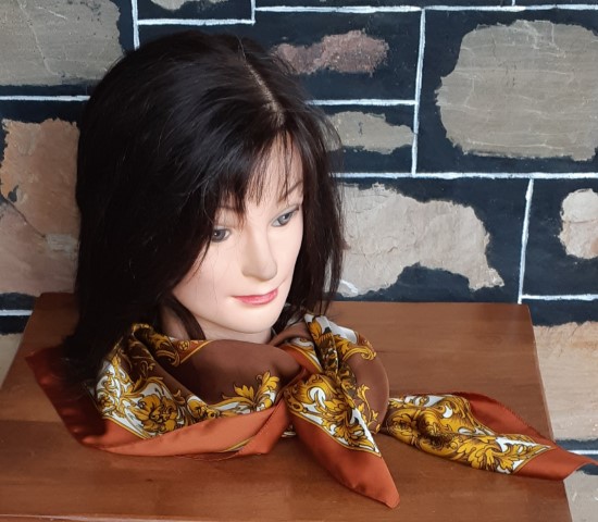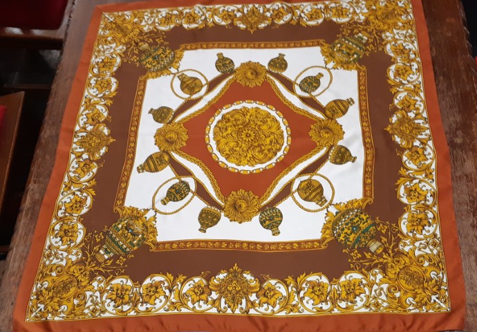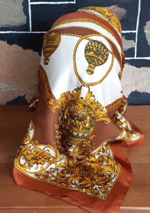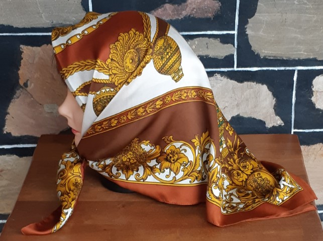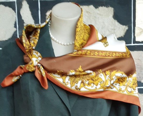 1970’s Scarf, Autumn tones print, size 88cm square, polyester.