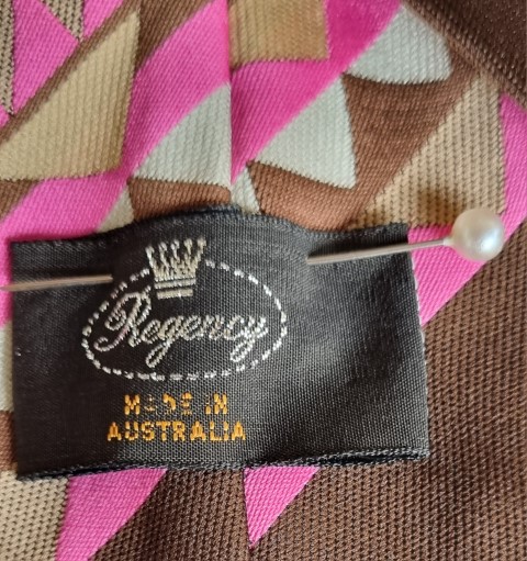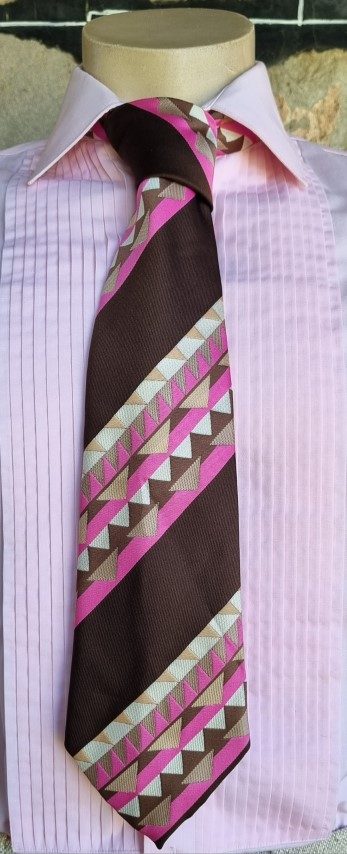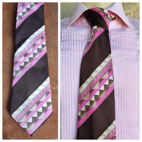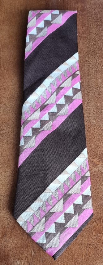 1970’s Wide Tie, brown/pink/taupe, polyester, by ‘Regency’, ‘new’, it still is attached to the original Retail Clip.
