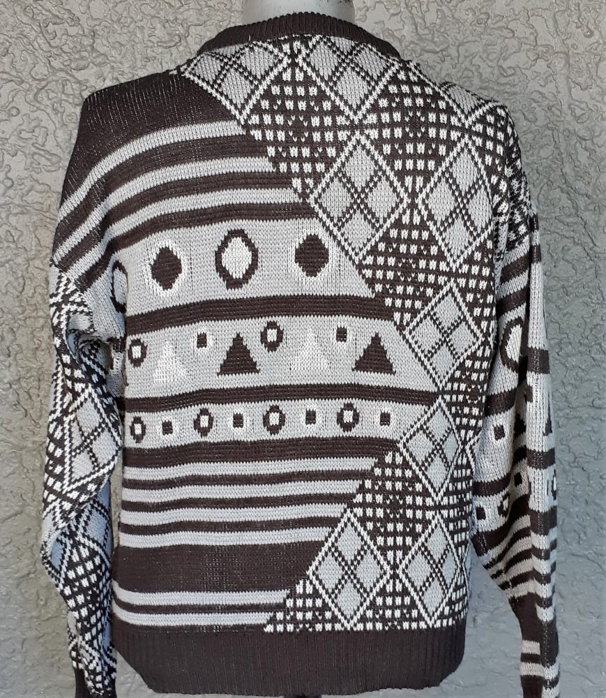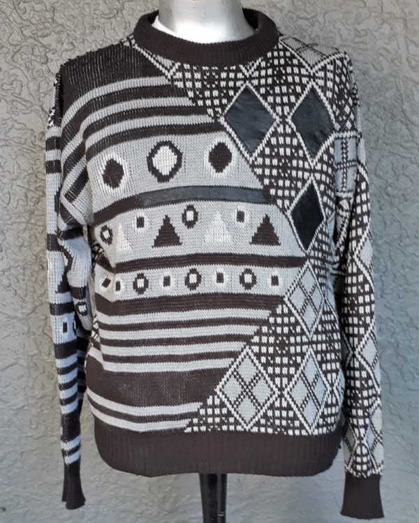 Leather trim was so popular in the 80’s to add to garments, just like this acrylic sweater, washes well too!