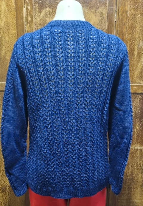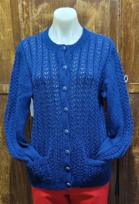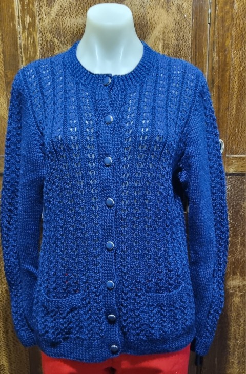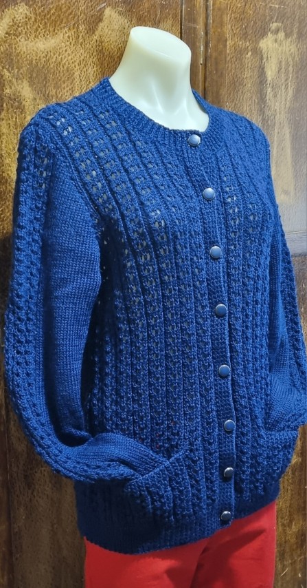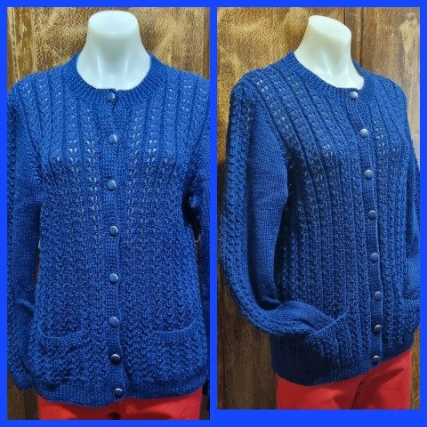 Masterfully hand knitted, this cardigan is so lovely, the photos don’t do her justice. The 2 front pockets and quality brass and vinal buttons, make this a true delight.