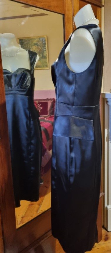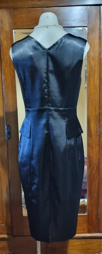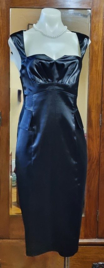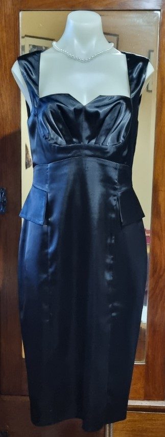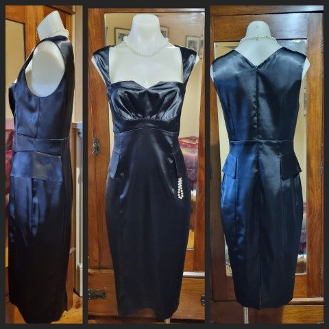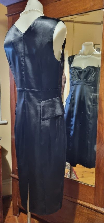1980’s Evening Dress, Black Satin Polyester, by ‘Razak’, size 10.