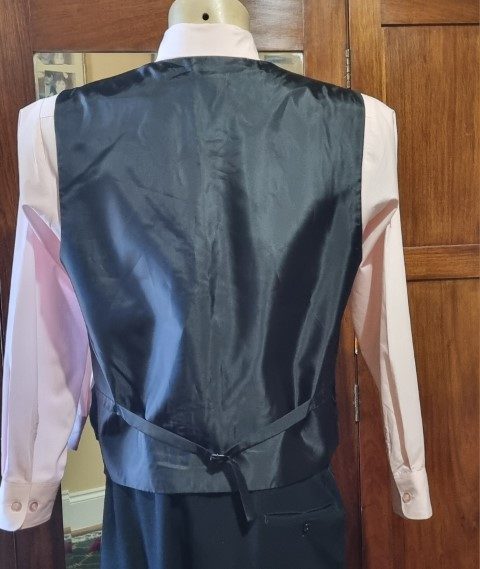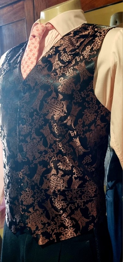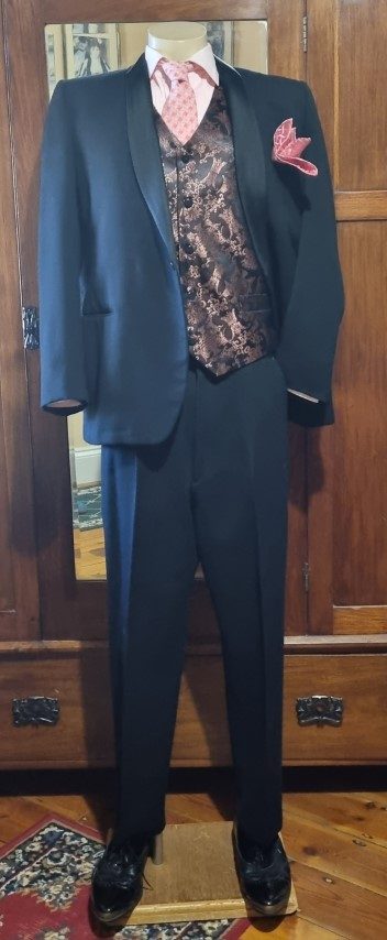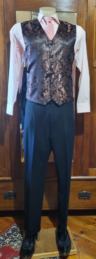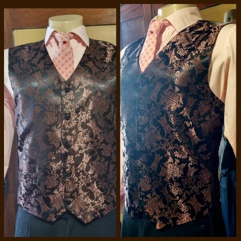 A very dapper, dressy style. In the gallery we have shown this cool vest with our Pink Dinner Shirt, Pink 70’s Tie, and 50’s Tuxedo, it looks fantastic, don’t you think? None of those items are included of course.