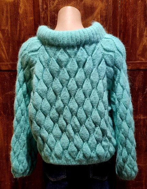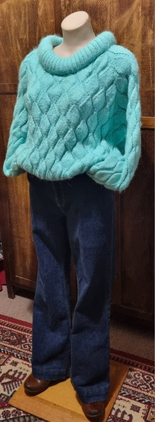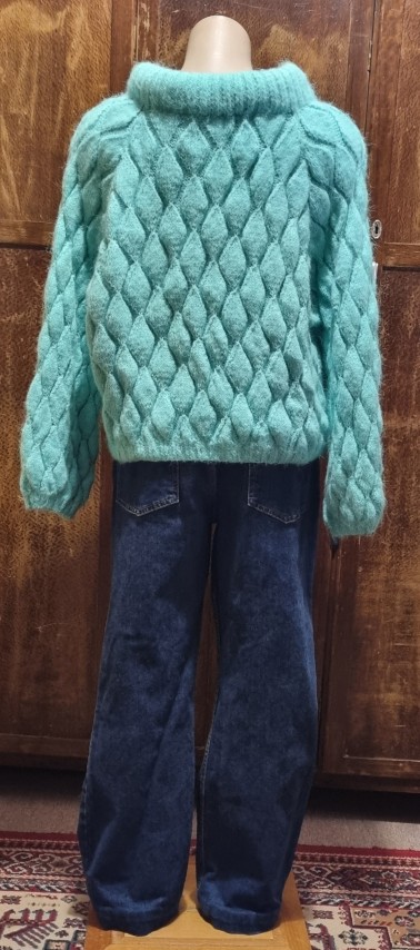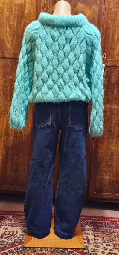 I wish you could feel through the internet, because you would just want to snuggle into this masterfully hand knitted jumper. And, she looks great down or tucked up, especially with jeans, as demonstrated in the gallery photos.