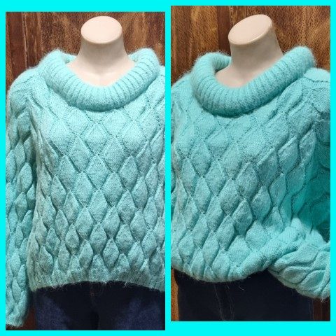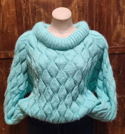 1980’s Jumper, Roll neck, cropped, Baby Blue, Acrylic/Mohair, hand knitted, size XL.