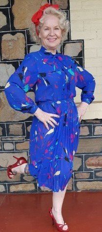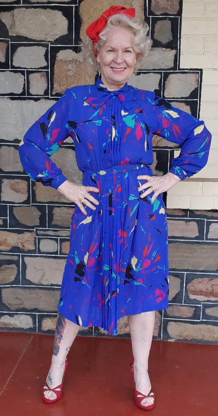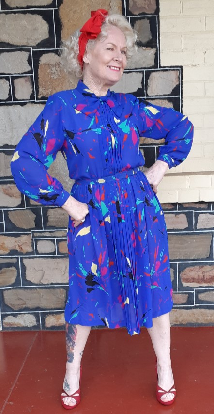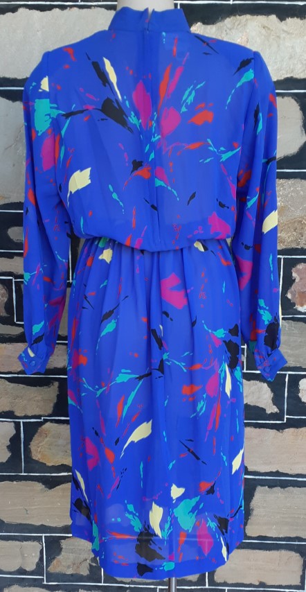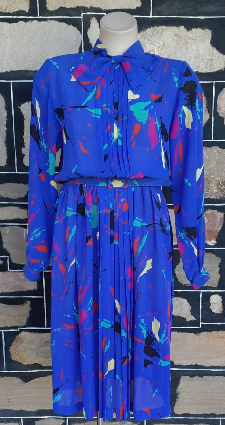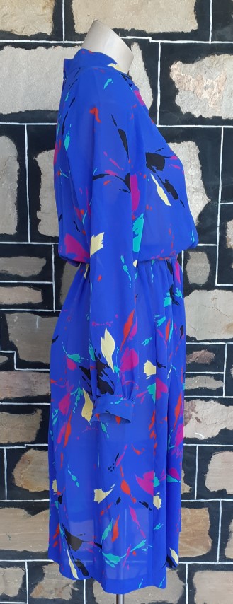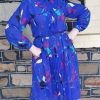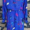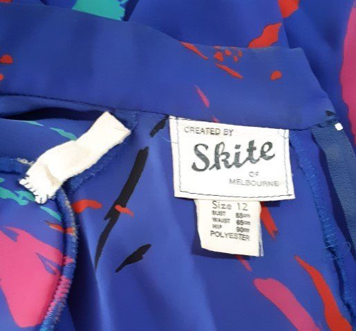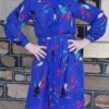 1980’s, Long sleeved dress by ‘Skite’, bright blue print, polyester, size 10-12