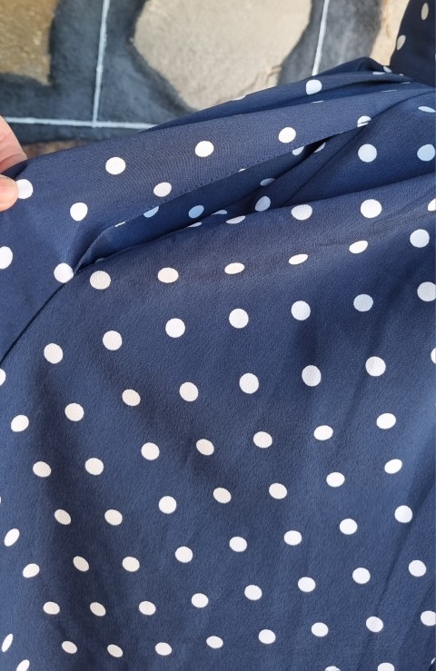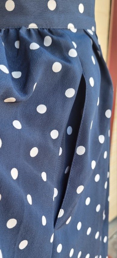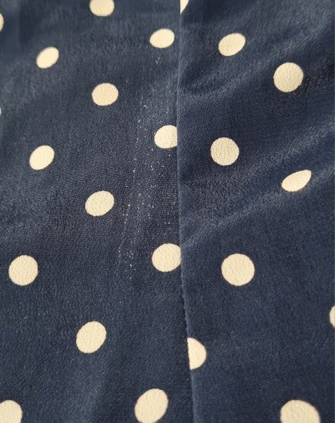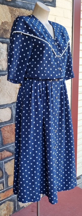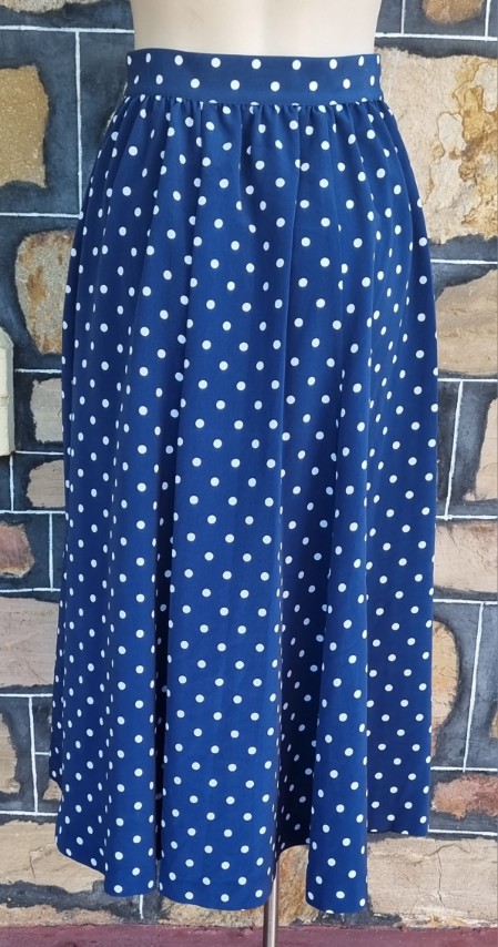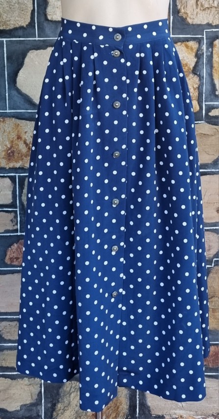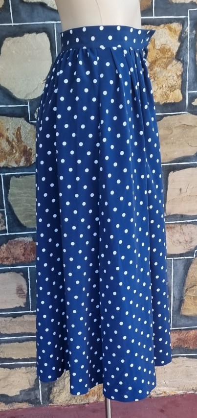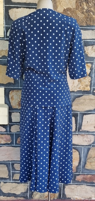 As is usual for designs from the 1980’s, they grab inspirations from the 1940s. The shoulder pads, the collar details, the polka dots, the fitted waist on the top, the gorgeous fall of the full skirt, and 2 side pockets! She is perfection (except for a tiny flaw in the fabric on the side of the jacket, barely noticeable, see photo in gallery).