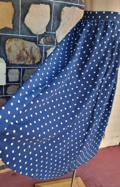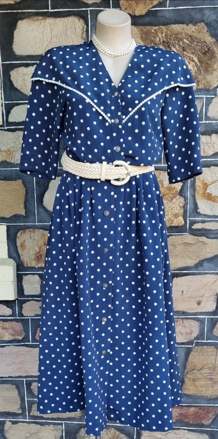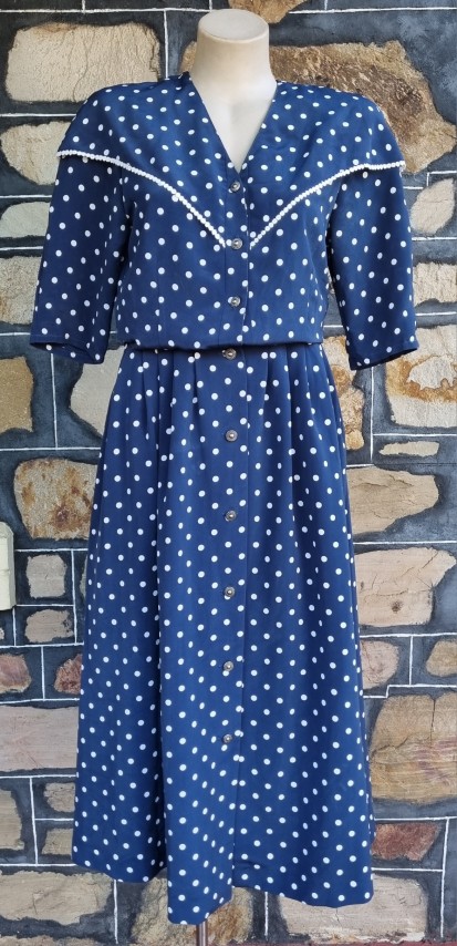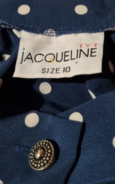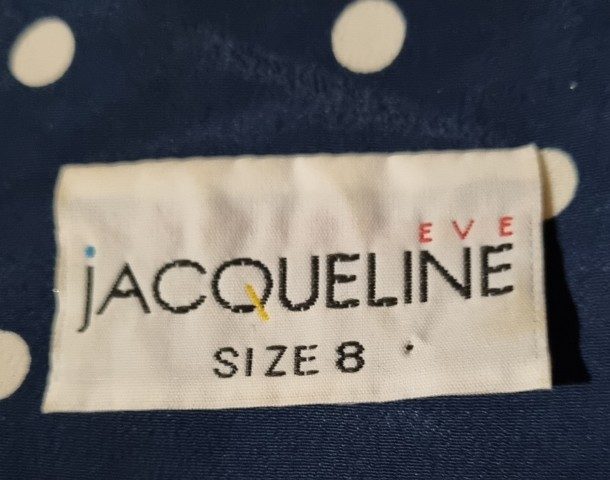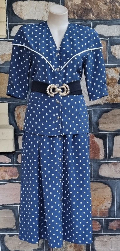 1980’s Skirt Suit by ‘Jaqueline Eve’, Size S, navy/white polka-dot, polyester.