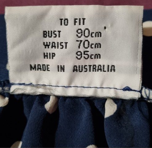 In a flat lay to top measures bust 93cm, waist 82cm, hips 93cm and length is 68cm. This label reads a size 10. The skirt label reads a size 8, being 66cm in the waist, so I have sized her a small, the length of the skirt is 83cm.