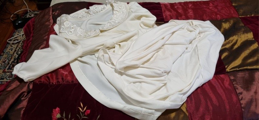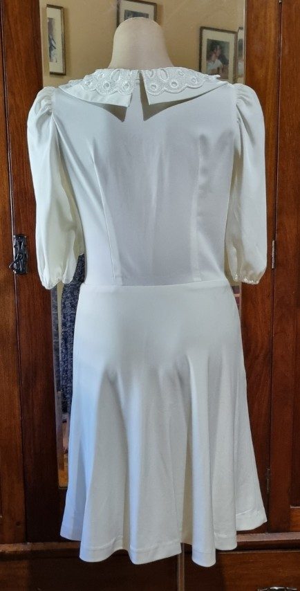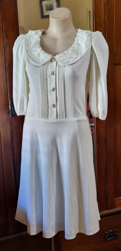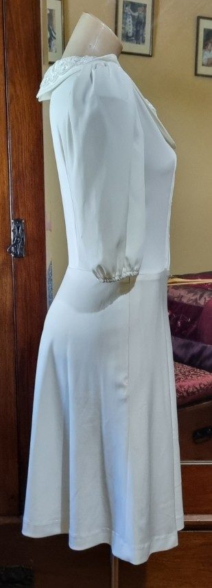 1980’s White Jersey Dress, Short Sleeves, Lace collar, size 10