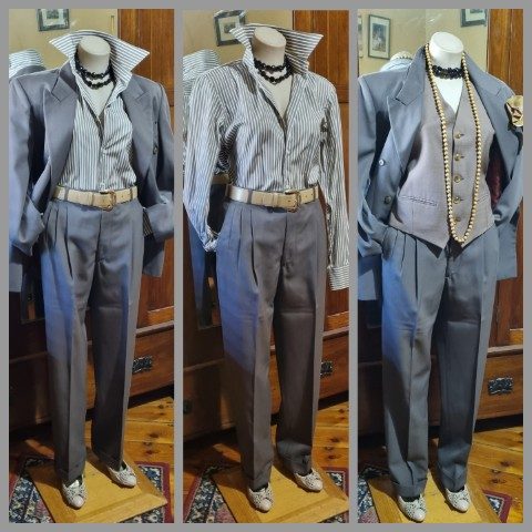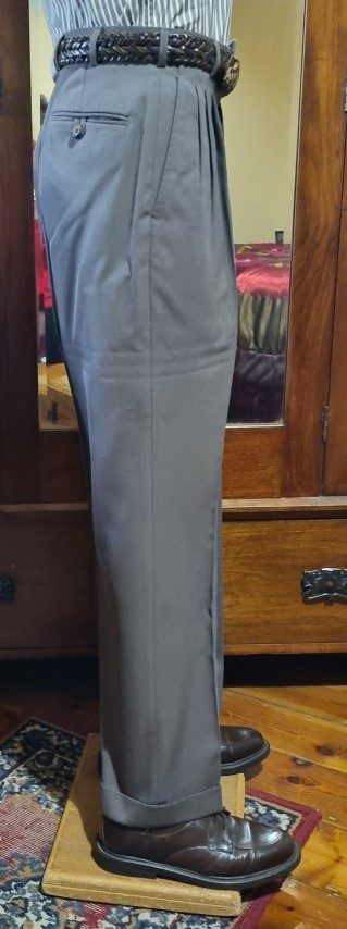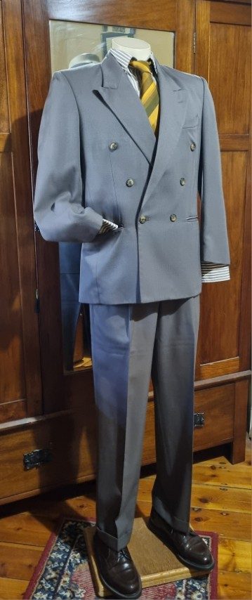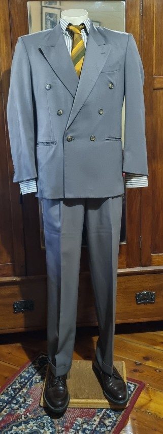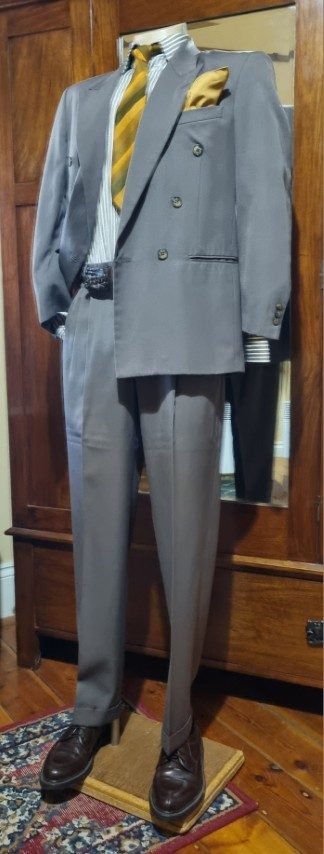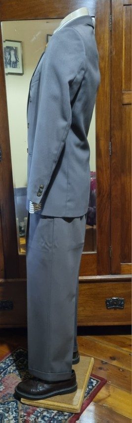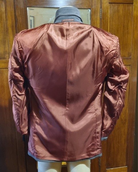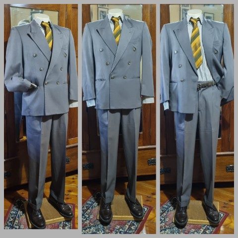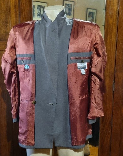 In the 90’s, Jackets were typically very oversized, and this suit is no exception. It measures in a flat lay, the chest 42″, waist is 38″, hips are 39″, length is 29″ and the shoulder span is 18″. So, usually this would equate to a size medium, but not in this case. The pants waist is 33″, therefore, the whole suit is a X Small to Small. There is 2″ in the waist to let out if need be. The length of the pant is 4i”. The sleeves are shorter too, another feature of this design era.