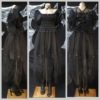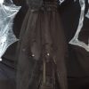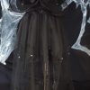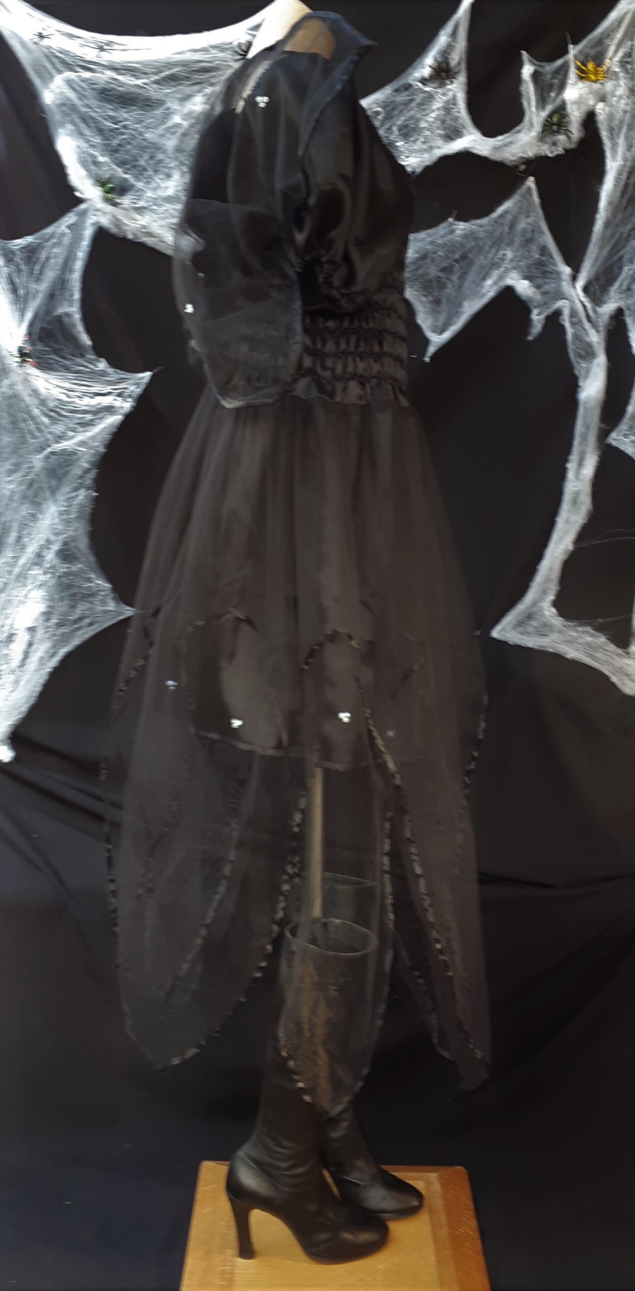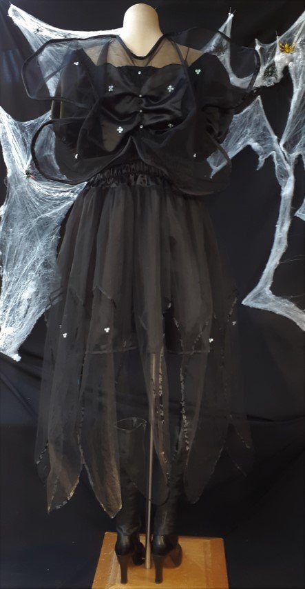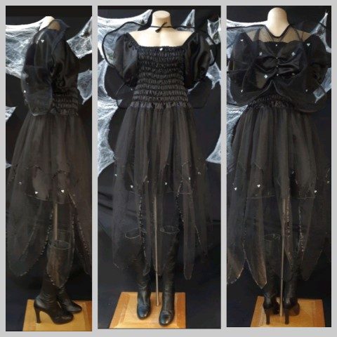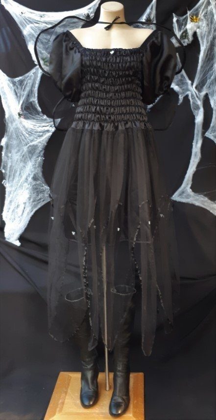 Black Fairy costume with attached wings, polyester, size 10-14 because there is a lot of stretch through the shirring.