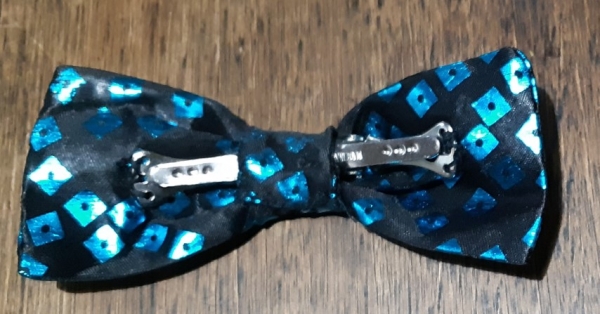 Bow tie, Black & aqua print, polyester, metal clip, excellent condition.