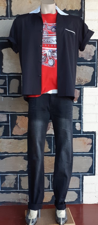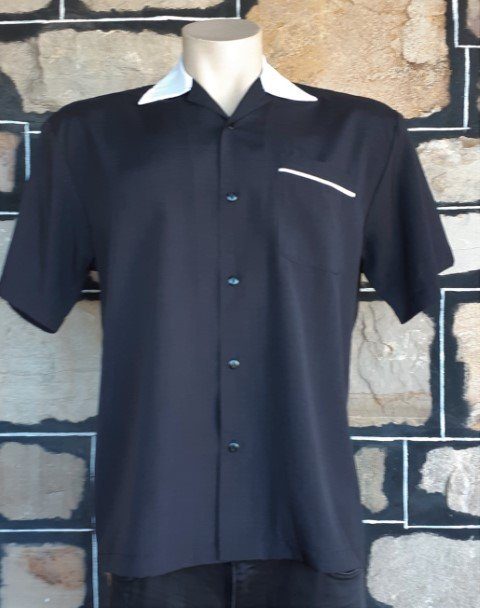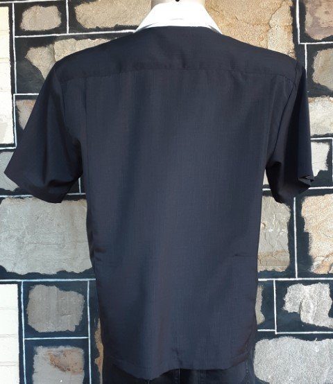 Bowling shirt, black with white collar & piping trim & action back, by ‘Steady Clothing’, USA