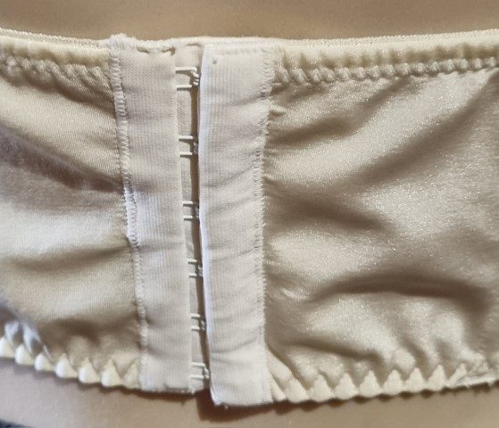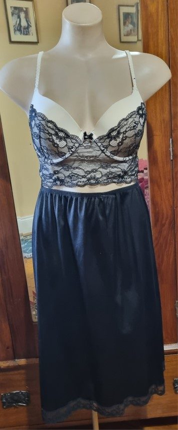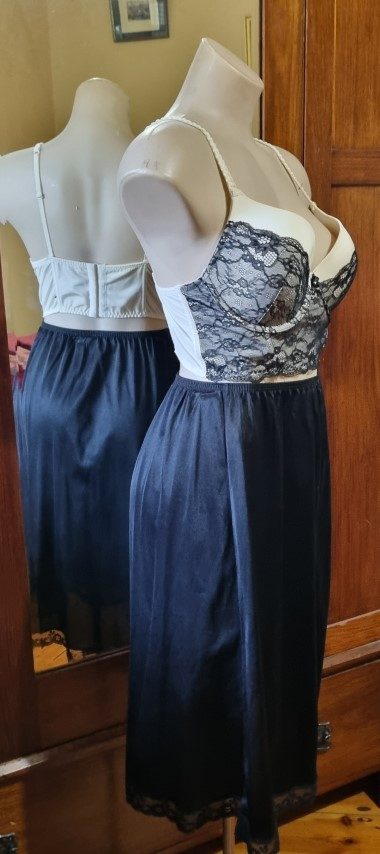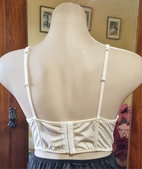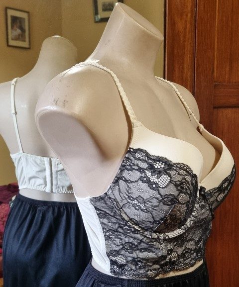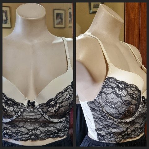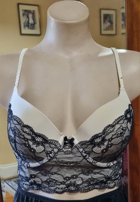 Bustier top, Cream/black lace, nylon, size 14C, by ‘Kmart’.