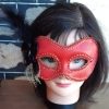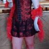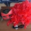 Includes, dress, masquerade mask, choker, red feather and boa. Fishnet stockings and heels not included.