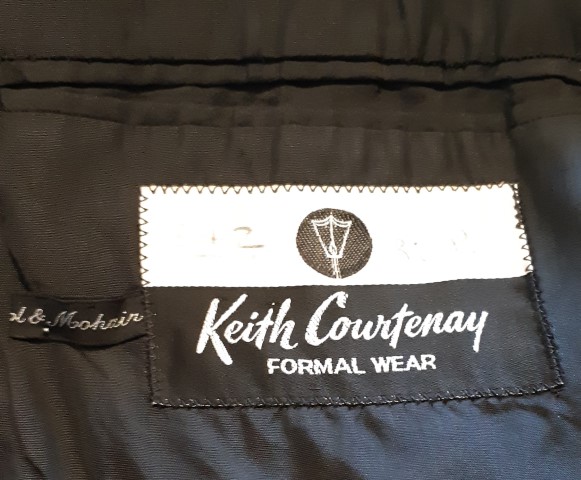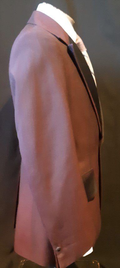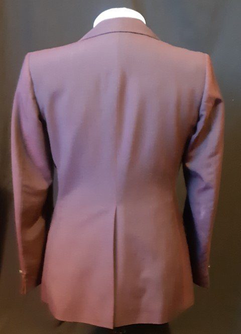 Dinner Jacket, Maroon with Black lapels, by ‘John Cook Men’s Wear’ for Keith Courtney Formal Wear, imported from and made in USA.