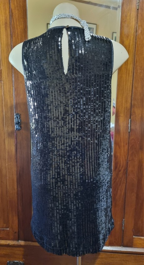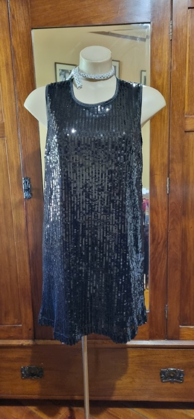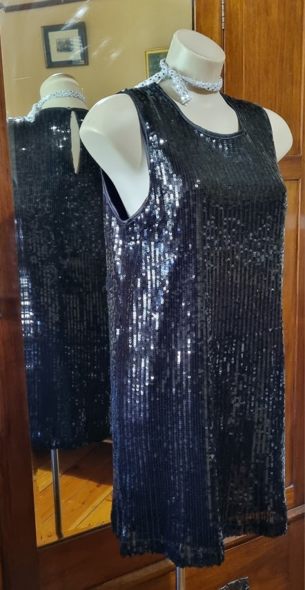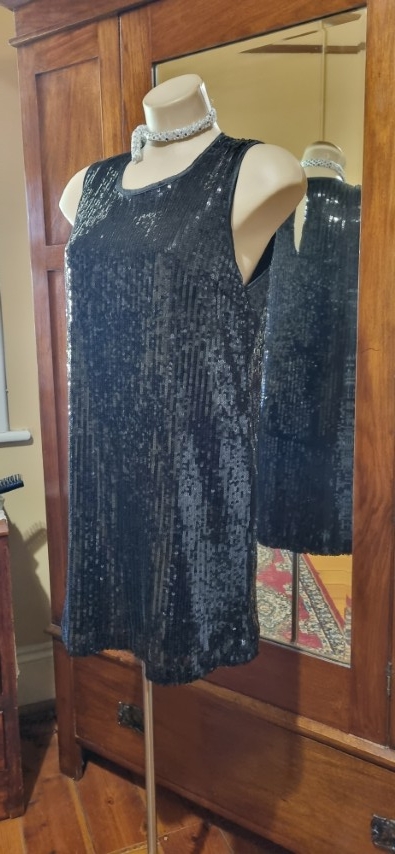 Dance the night away is this fab frock! Slip it over your head and away you go. She is fully lined, freshly laundered and in excellent condition. The silver sequined choker is included too.
