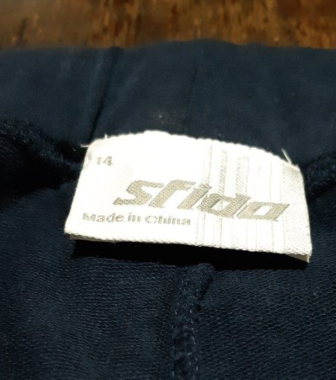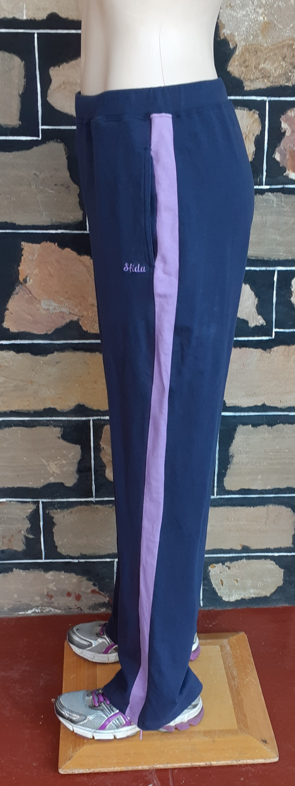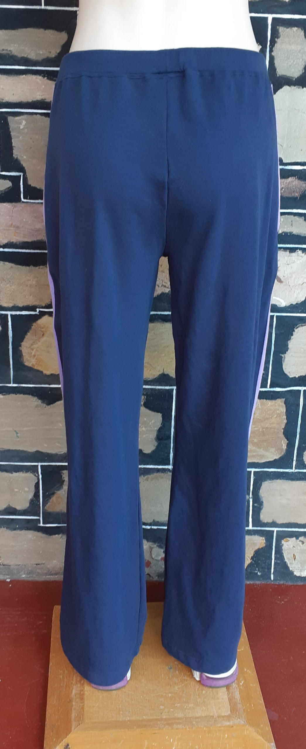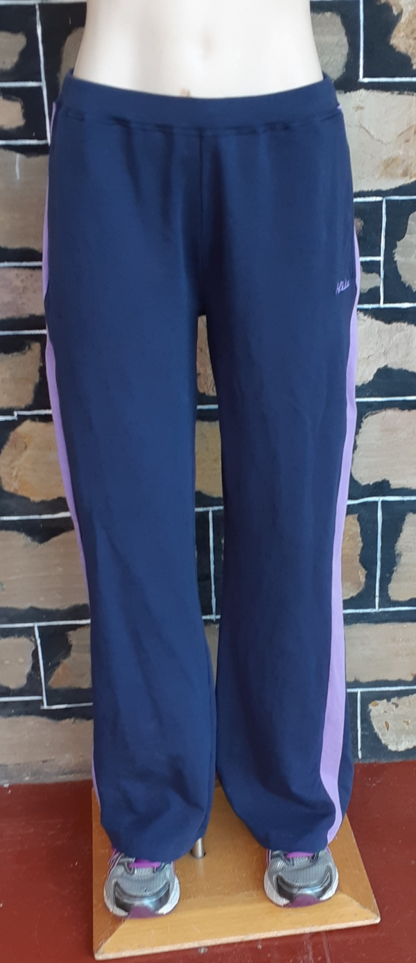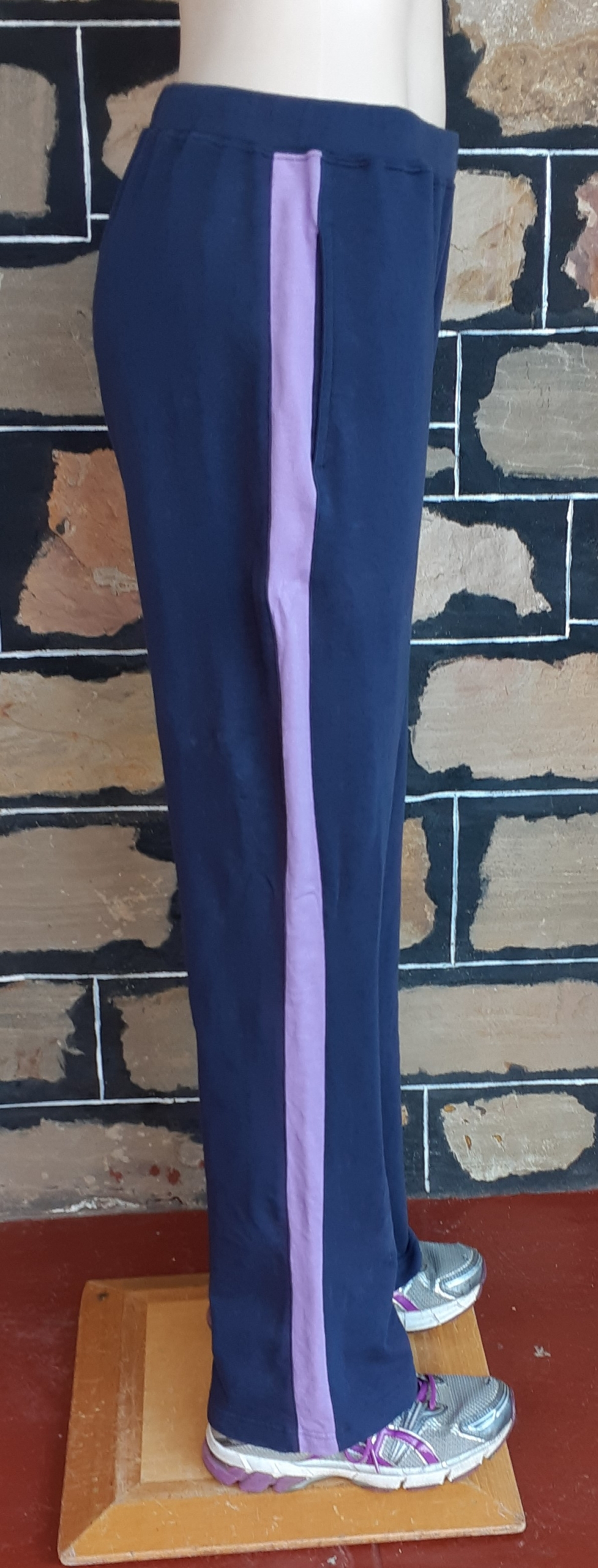 Draw string track pant, cotton/fleece, navy/lavender, by ‘Sfida’, size 12, the label reads size 14, so it is possible to fit this size too because of some stretch in the fabric.