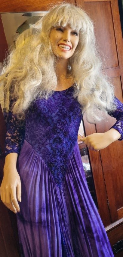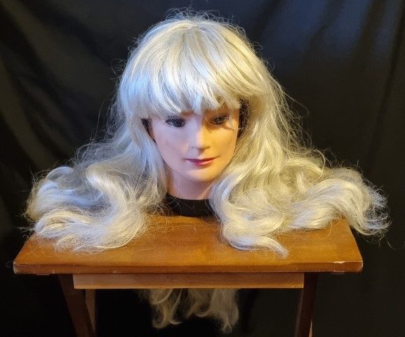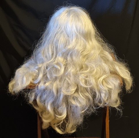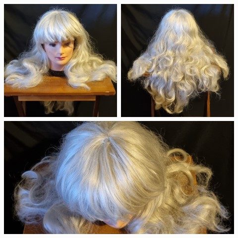 Extra Long Grey Wig with fringe, synthetic fiber.