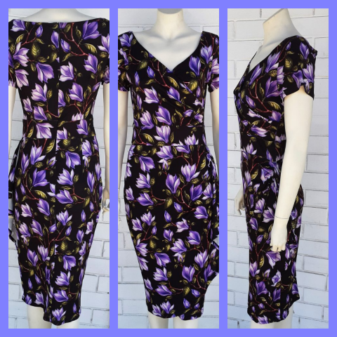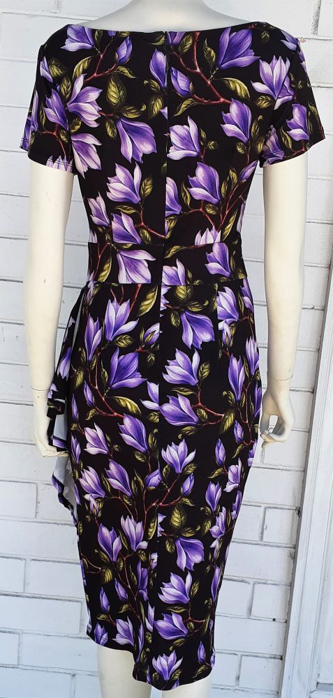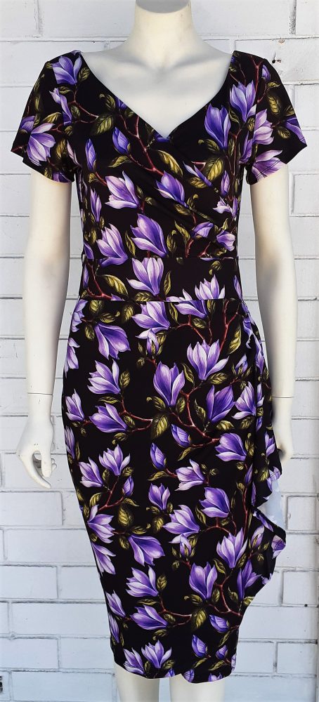 Dancing purple flowers on delicate branches and luscious leaves bring a decadent feel to this Elsie dress.