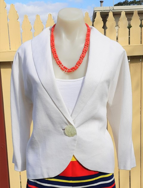 In the gallery we have shown just one way to wear this versatile Spring jacket, the beads, singlet top and 60’s striped skirt are not included.