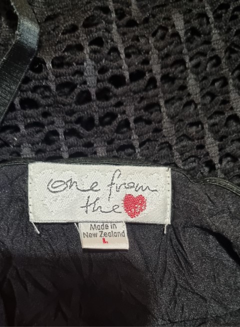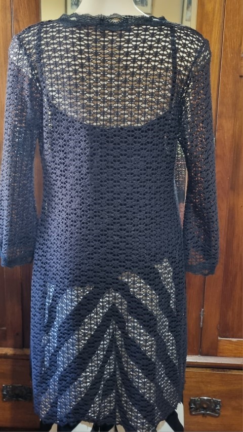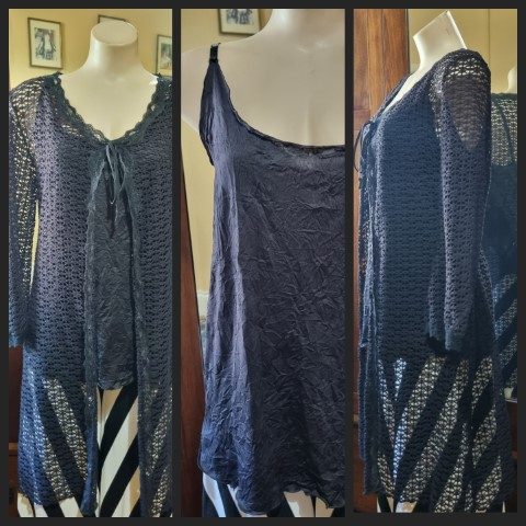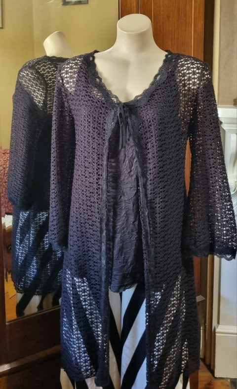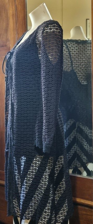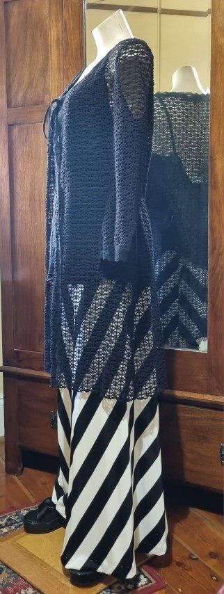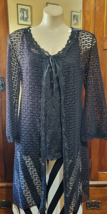 Long Line Cardigan, polyester fishnet, & singlet, black, size L, by ‘One from the Heart’