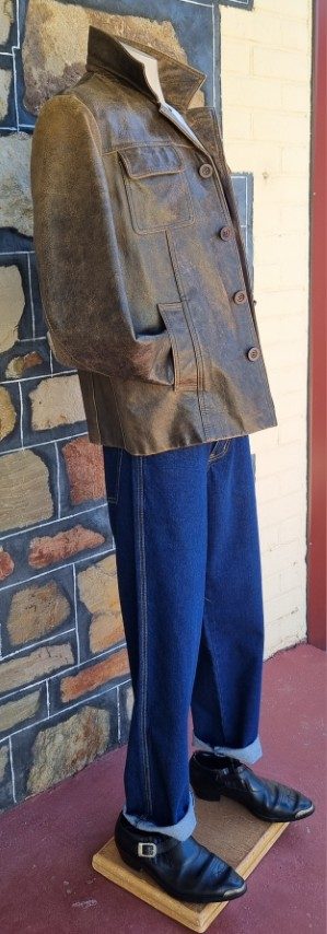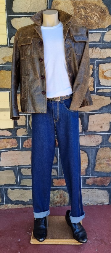 This appears to be a modern jacket, hard to tell because the label is missing. However, I feel 50’s vibes when I look at it. So I took photos of it with a white tee, this is not included. I took further photos and have popped them in the gallery, just to show you how cool it looks with 50s jeans and boots, they are not included either.