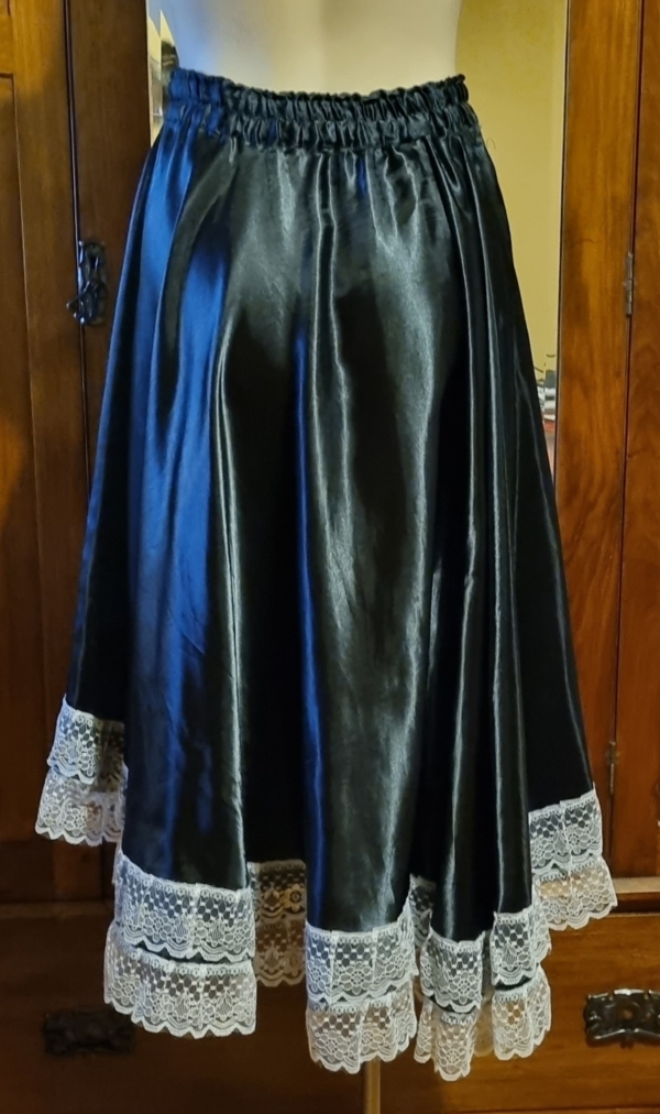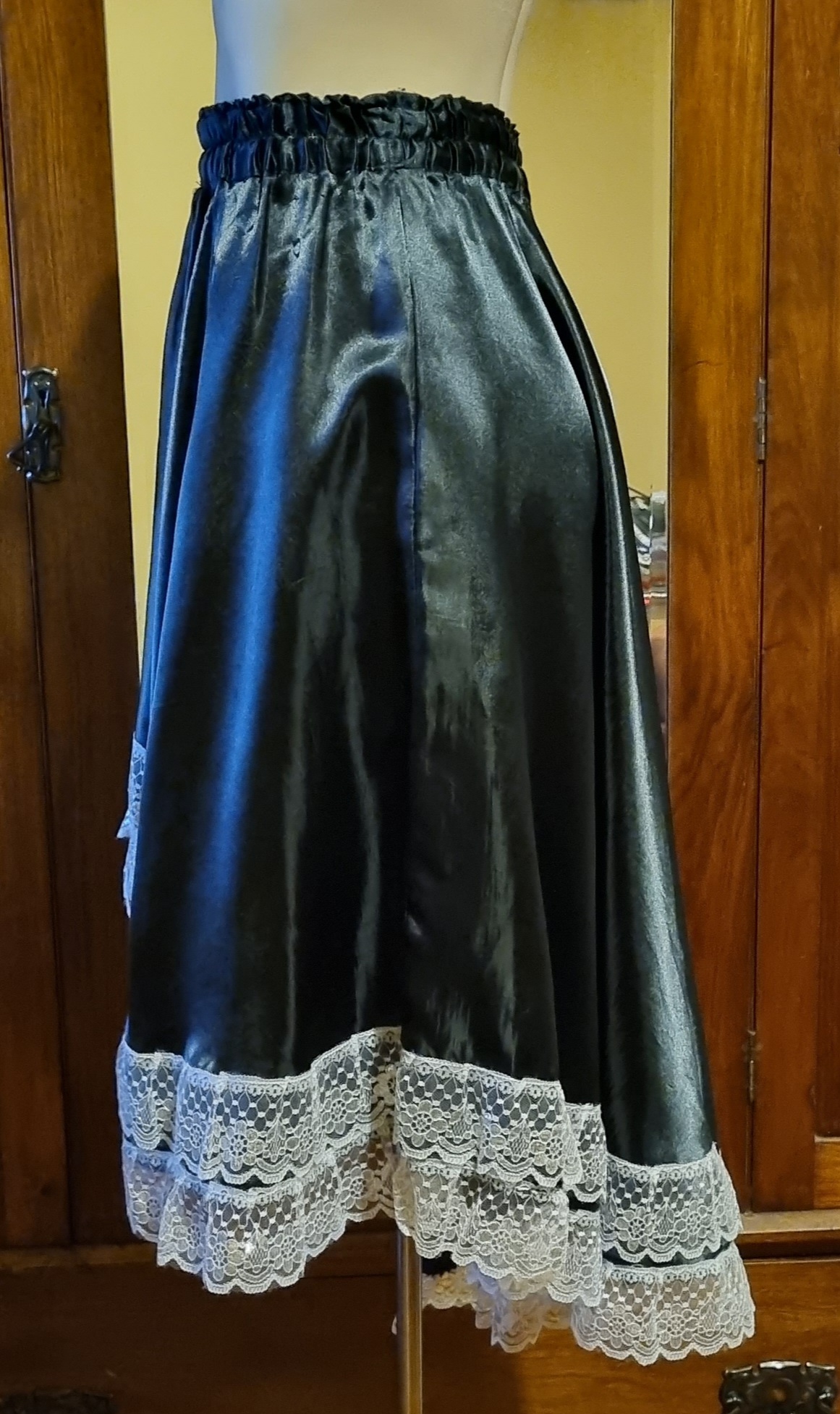 The skirt elastic waist is 83cm-90cm, the length to the shorter part of the skirt is 45cm and to the train at the back it is 82cm.