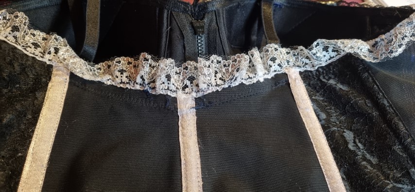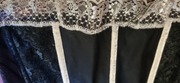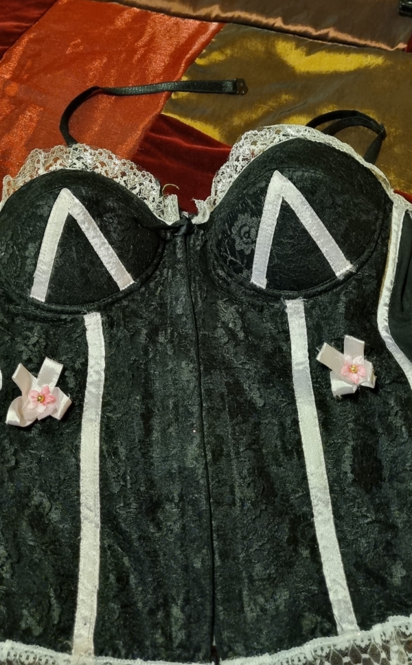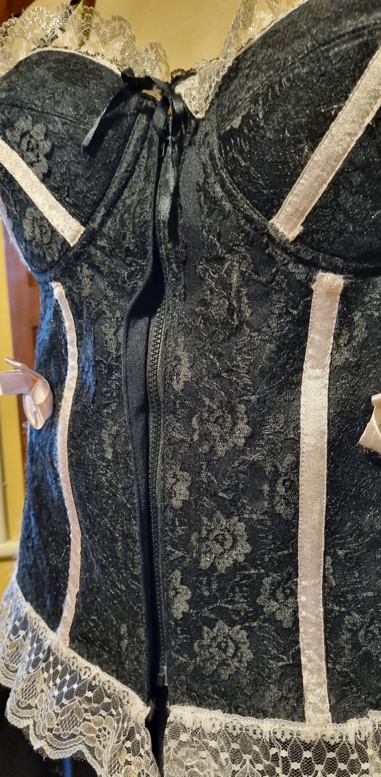 The bustier top is 104cm in the bust, 86cm in the waist, 100cm in the hips. It has a front zip opening.