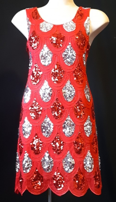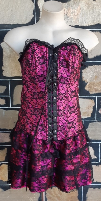 ‘Nifty Fifties’ costume, top, skirt, belt + neck tie, polyester, pink/white, size M