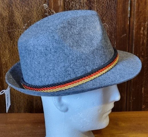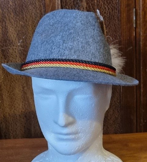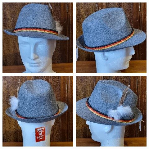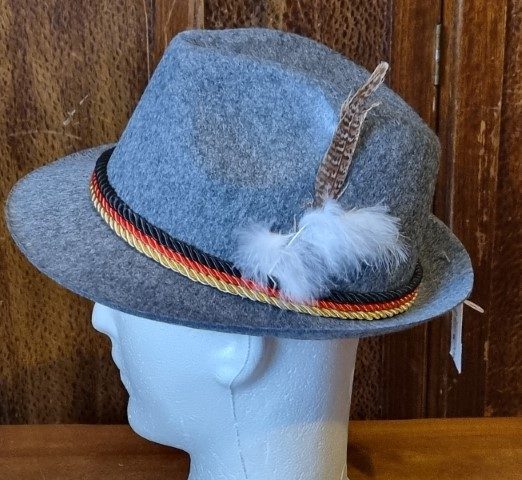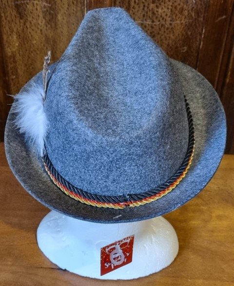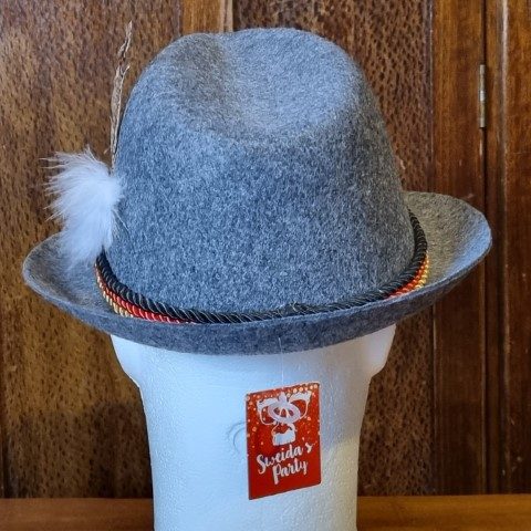 ‘Oktoberfest’ Hat, grey with feathers, by ‘Sweidas’, one size, Paper Mache.