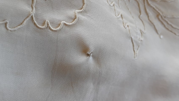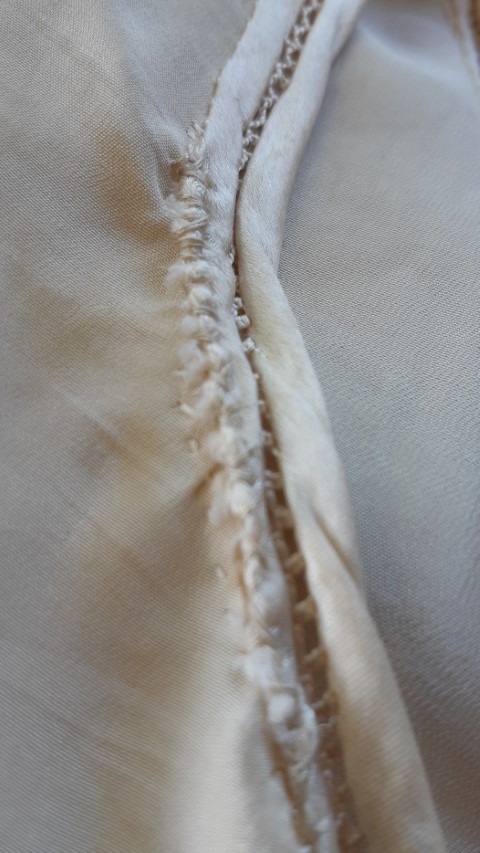 It has been freshly laundered, there was a couple of places that the ribbon needed re-attaching (the biggest one just around the left sleeve is the photo attached) so I have done this to the best of my ability so that it doesn’t detract from it’s beauty. There was one tiny hole near it, so that is mended too. Were the hook and eyes are down the side, I have re-sewn the catch but left the original hooks for authenticity.