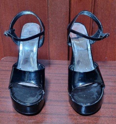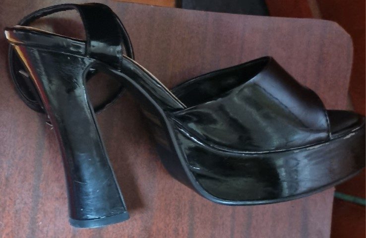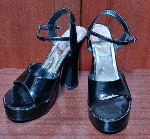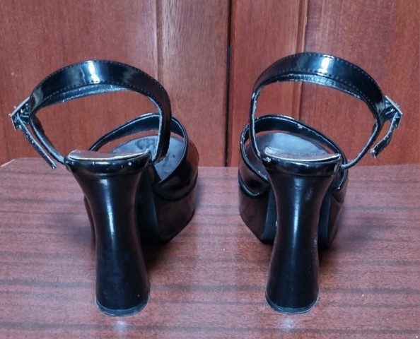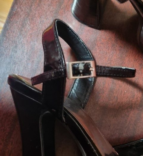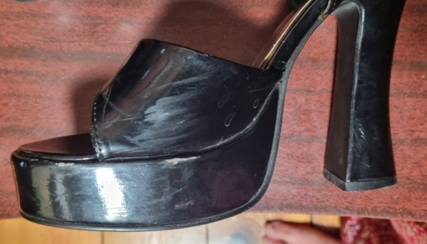 These fabulous heels are in very good condition except for – the strap where it buckles is a worn and will need repairing, you will get a couple of wears, but that’s about it, so for this reason I have the huge reduction applied. There are a couple scuffs too, as seen in the photos. Besides that, the sole, and heels, which are 13cm high, are very good.