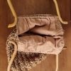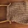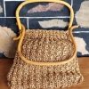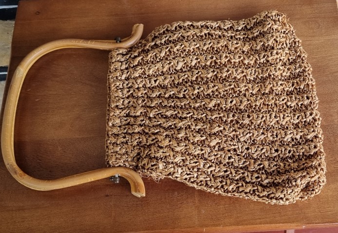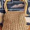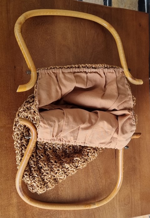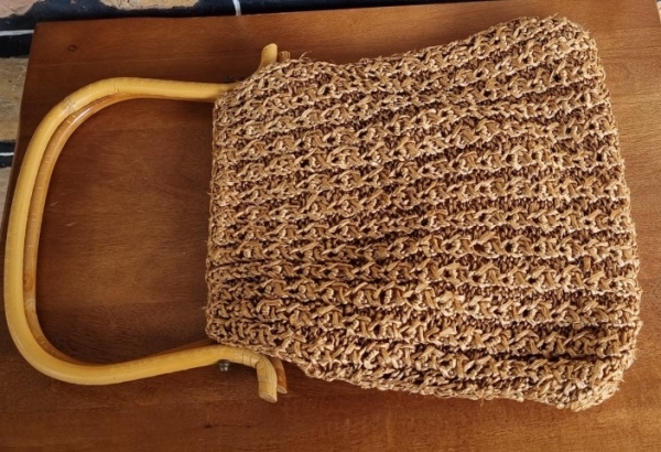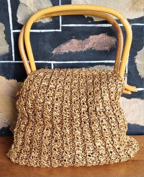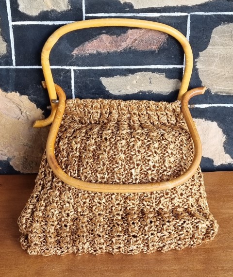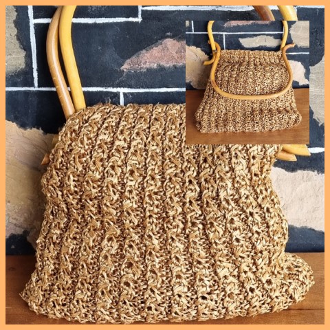 Raffia Crochet handbag, caramel, wooden handles, the 1970s.