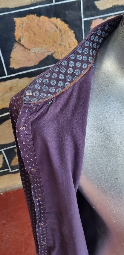 This shirt has interesting trims, in contrasting colours around the collar and down the front inside placket.
