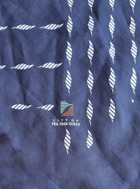 Scarf/neck tie/headband, ‘Tea Tree Gully Council’, polyester, it is 64cm x 67cm.