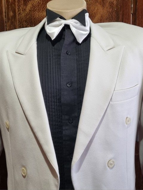 The bow tie is new, by ‘Carnival Products’. The jacket has been dry cleaned and is in excellent condition, fully lined.