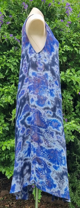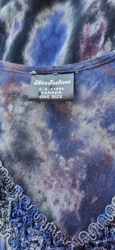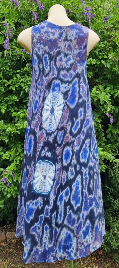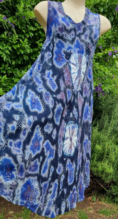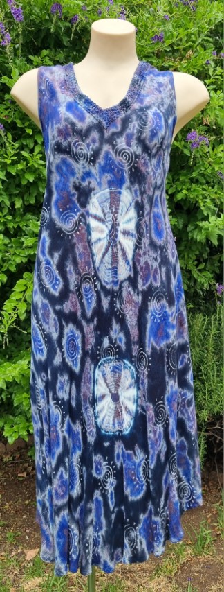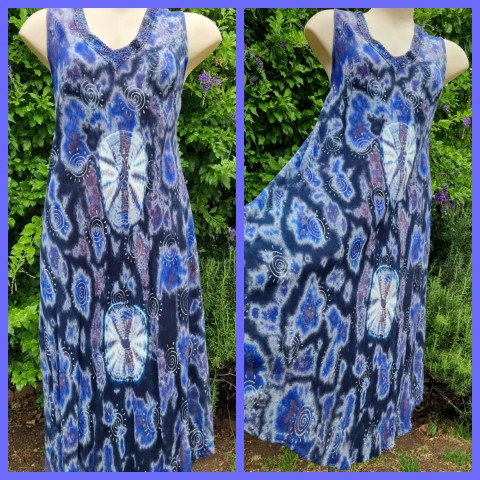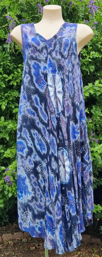 Tie-dye, A-Line summer Dress, rayon, Purple, 70’s inspired, one size, by Shiva Fashions, of Canada.