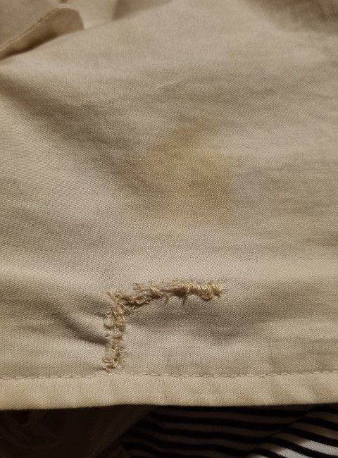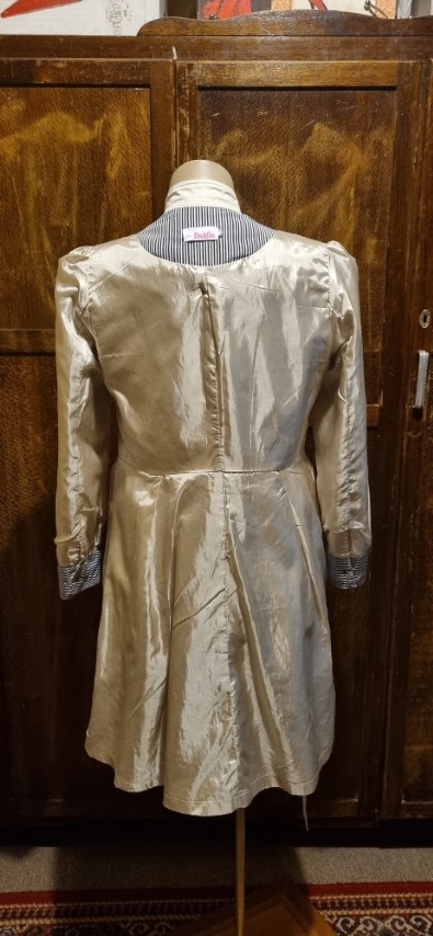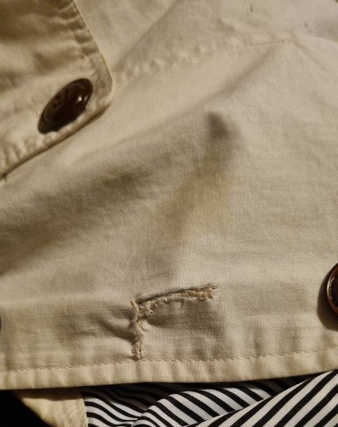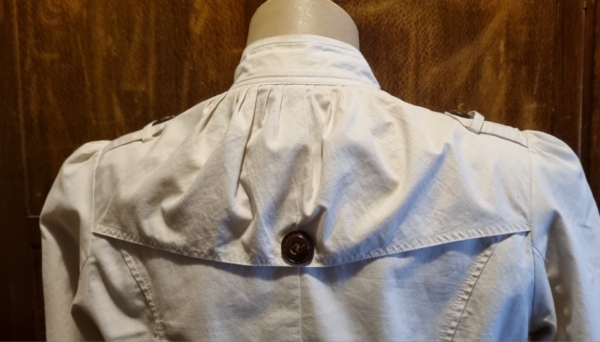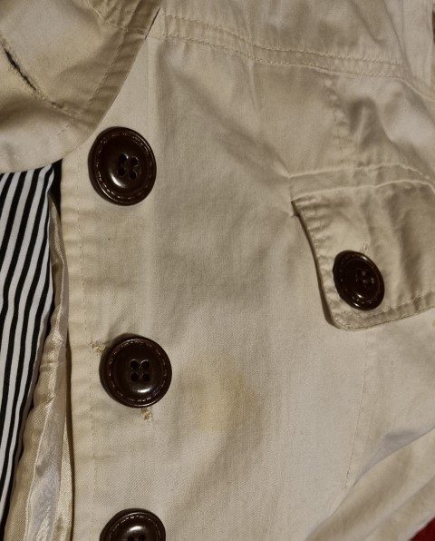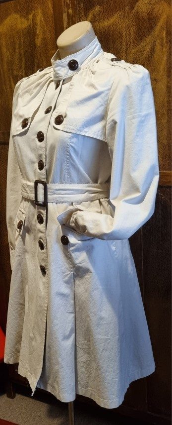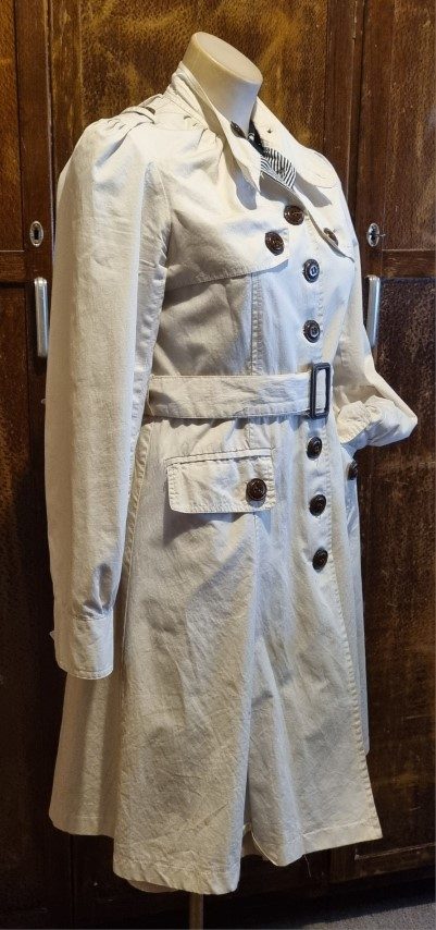 It actually breaks my heart to find this pretty, versatile coat, a new home. I bought her in London 17 years ago, when I was a size 10, but sadly, more of 14 these days! I only wore her a handful of times, hence the excellent condition she is in, except for a tear that has been mended under a button, see photos. The price has been decided with this repair in mind. It has been freshly laundered and is ready to go!
