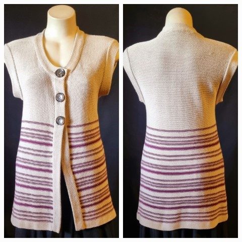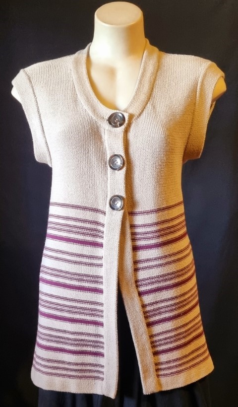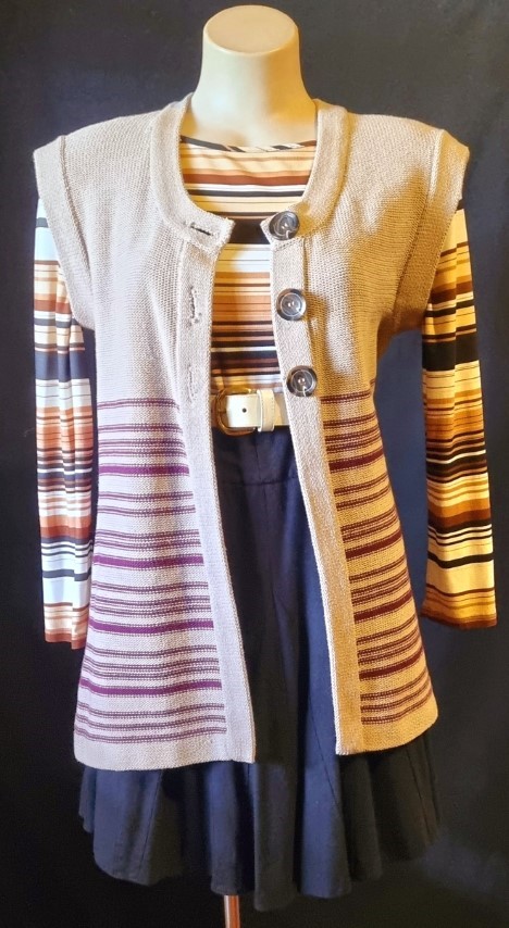 Wear it done up or open, it is a slimline vest. As can be seen in the gallery photos, it can be worn with skirts, pants and jeans.