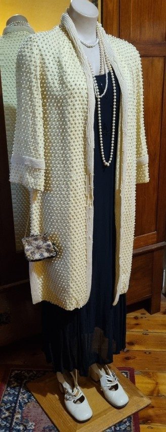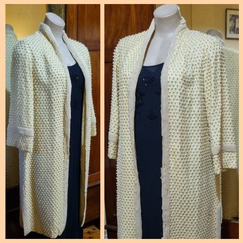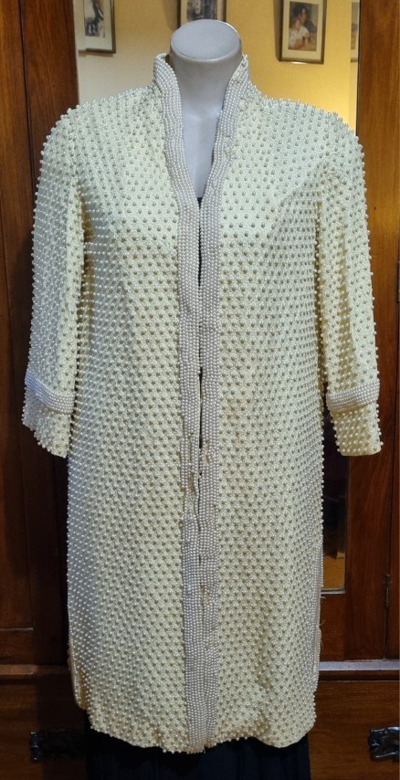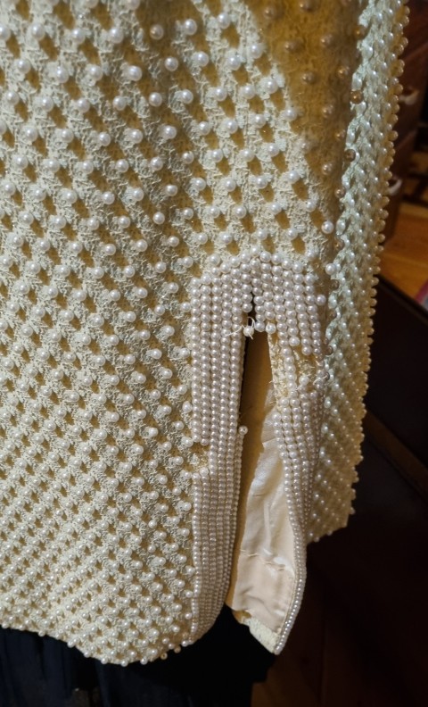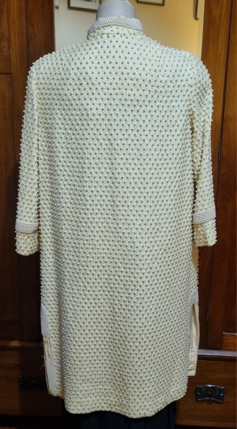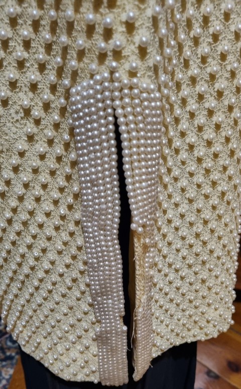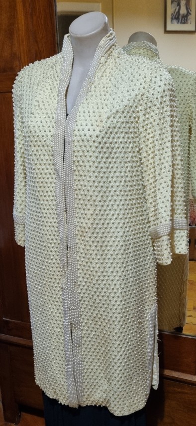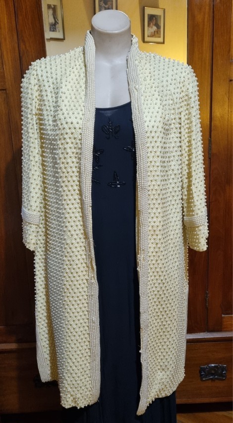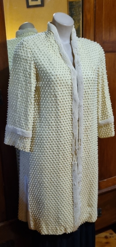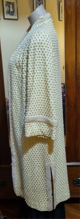Exquisitely crafted, hand sown beading, so rich with style. In saying that, although I have very carefully hand washed her, and she is so clean inside and out, there are quite a few beads missing. I have included the few that fell off during washing, but, as you can see from the many photos in the gallery, they do need replaced. My idea was to perhaps undo a few rows around the bell cuffs, this should give you enough to all the repairs, hence the huge price reduction.