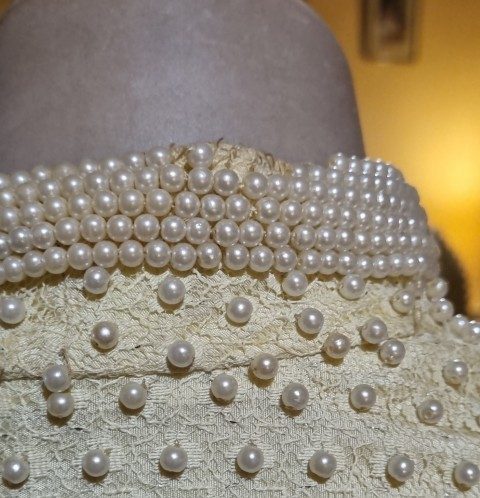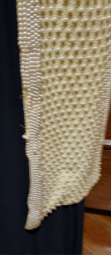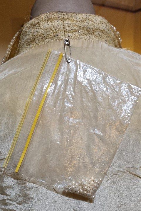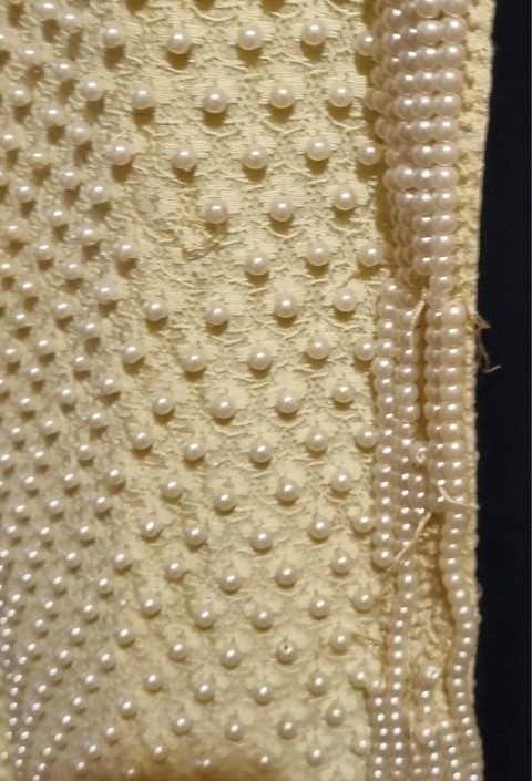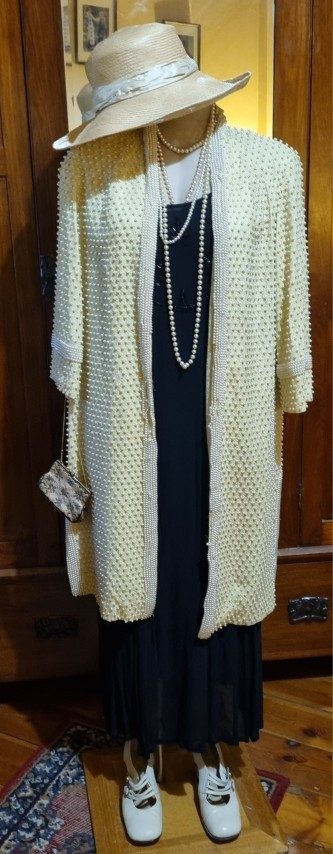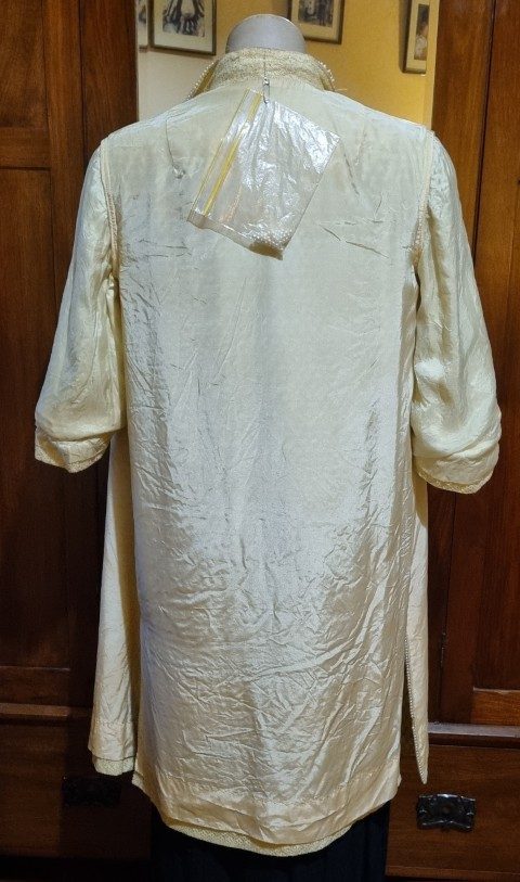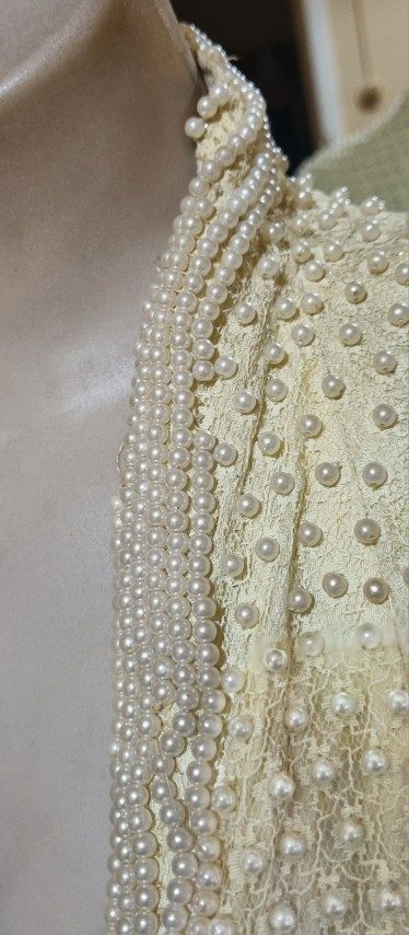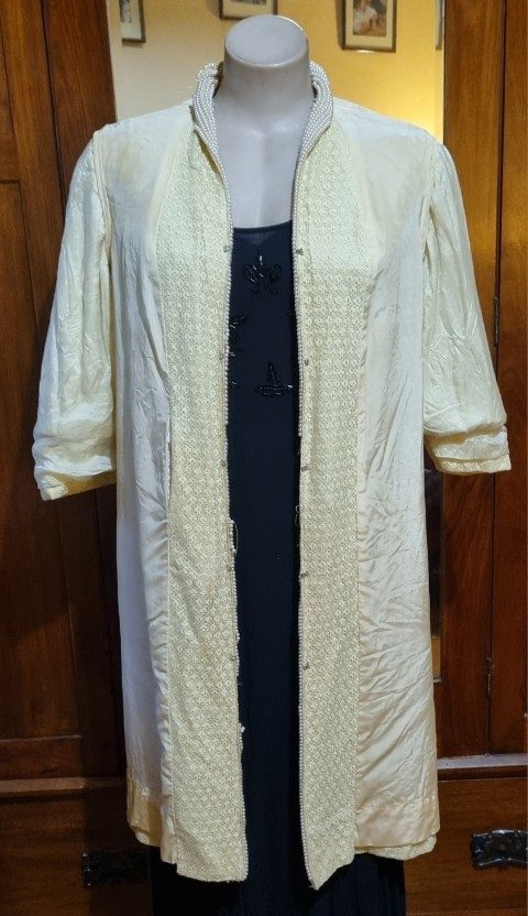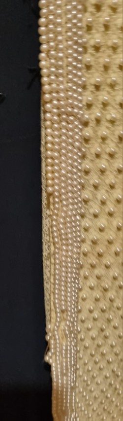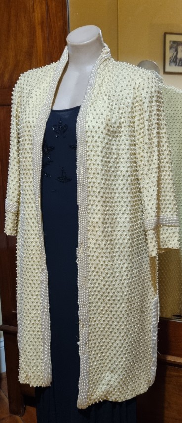Exquisitely crafted, hand sown beading, so rich with style. In saying that, although I have very carefully hand washed her, and she is so clean inside and out, there are quite a few beads missing. I have included the few that fell off during washing, but, as you can see from the many photos in the gallery, they do need replaced. My idea was to perhaps undo a few rows around the bell cuffs, this should give you enough to all the repairs, hence the huge price reduction.