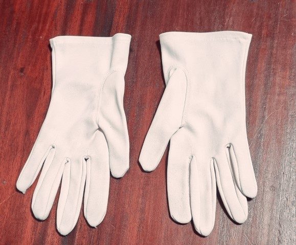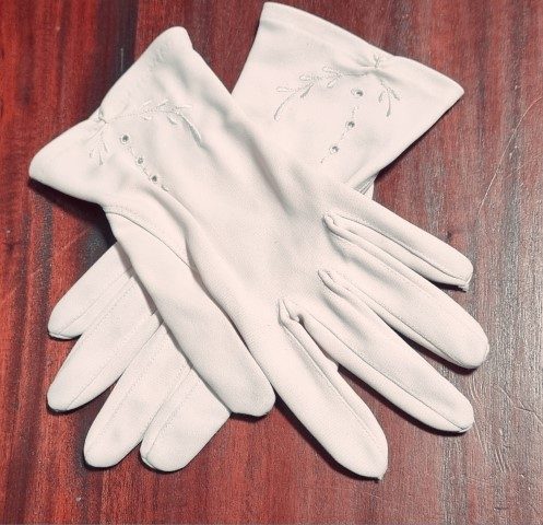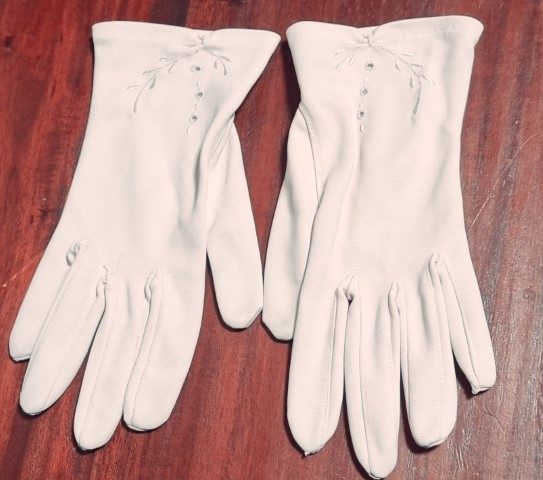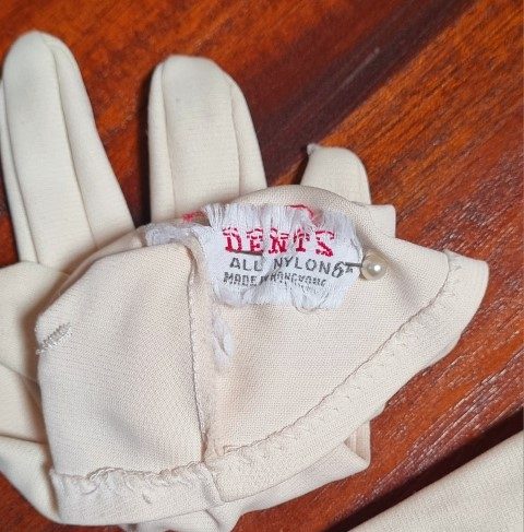Vintage gloves, wrist length, beige, nylon, by ‘Dents’, size 6