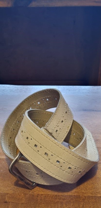 This lovely belt has been reduced because, although it is in very good condition, there are a couple of flaws. Firstly, there is a very pale pink section, see photos and the leather is worn by a tad in a couple of spots.