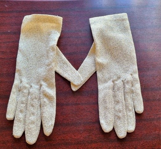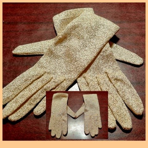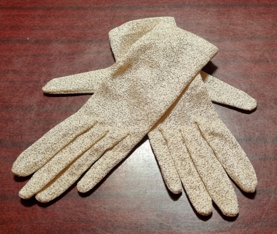 Vintage Lurex Glove, Gold, wrist length, nylon, size small.