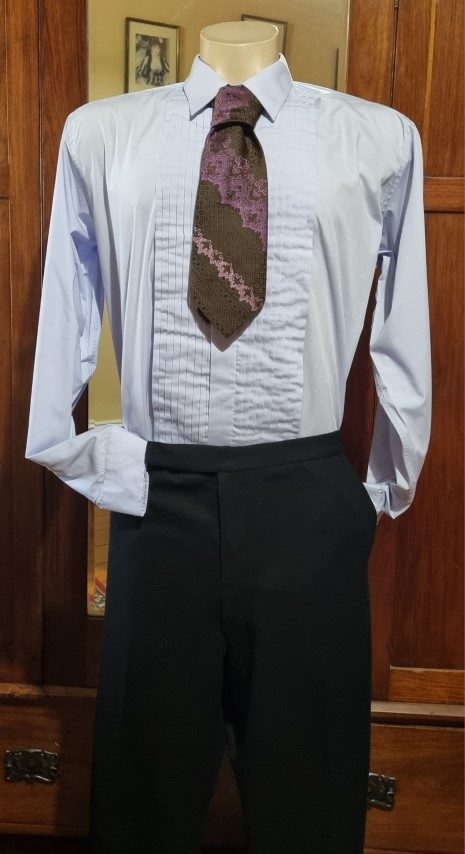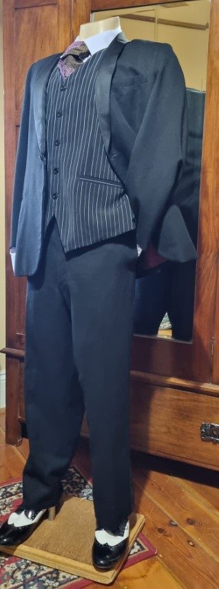 In the gallery I have shown it with and without a cool pinstriped waistcoat, our gorgeous Lavender Dinner, paisley tie and Spats shoes, non of these items are included.