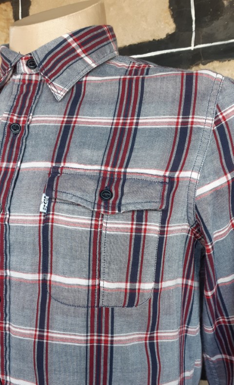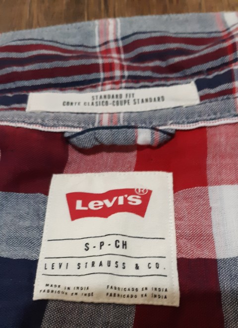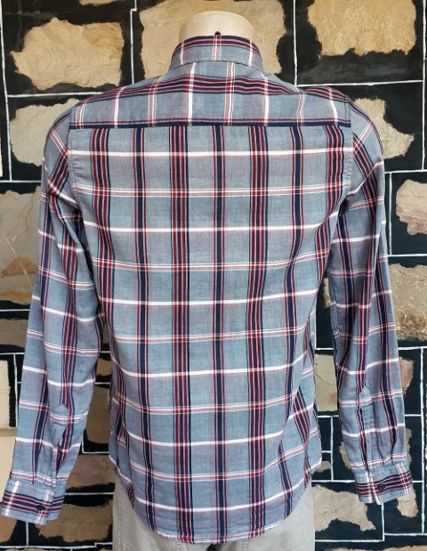Western Shirt, by ‘Levis’, white/blue/red checked, cotton, size M, chest is 41″, length is 29″.