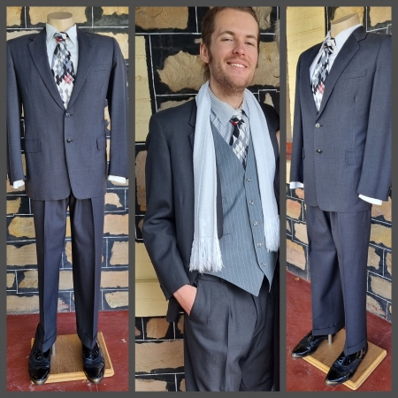 Product Condition: Used1950’s Tuxedo Suit, Black wool, by ‘Keith Courtenay’, size L, 36″ waist