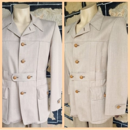 Product Condition: Used1990’s Double Breasted Suit, Taupe, by ‘Roger David’, Polyester/rayon, size XS-M